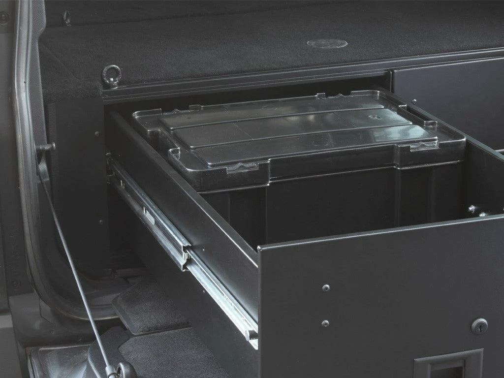 Diese kompakte Aufbewahrungsbox aus Kunststoff ist sehr einfach auf der Ladefläche zu arrangieren. Spare Platz ein, indem Du die Box vertikal hinstellst.