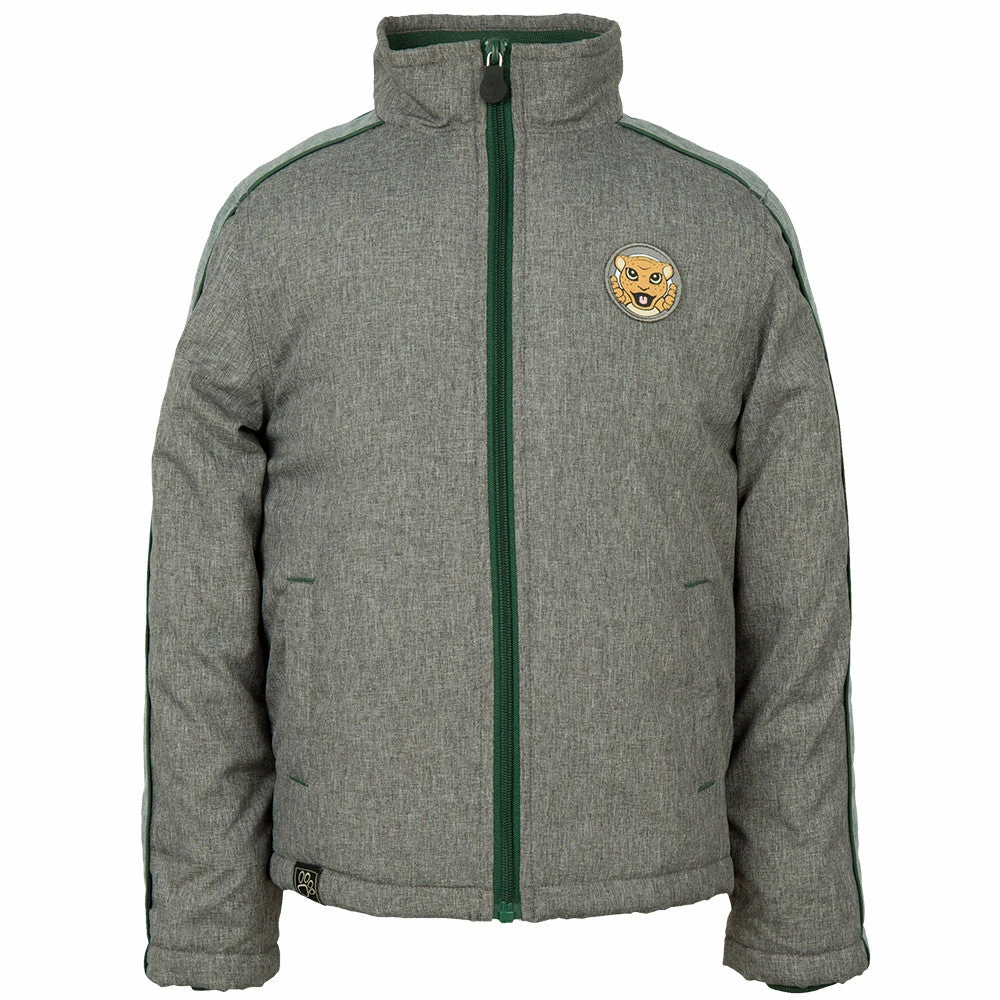 Grau melierte Jaguar Jacke für Kinder mit Reißverschluss und kontrastfarbenen, grünen Paspeln.