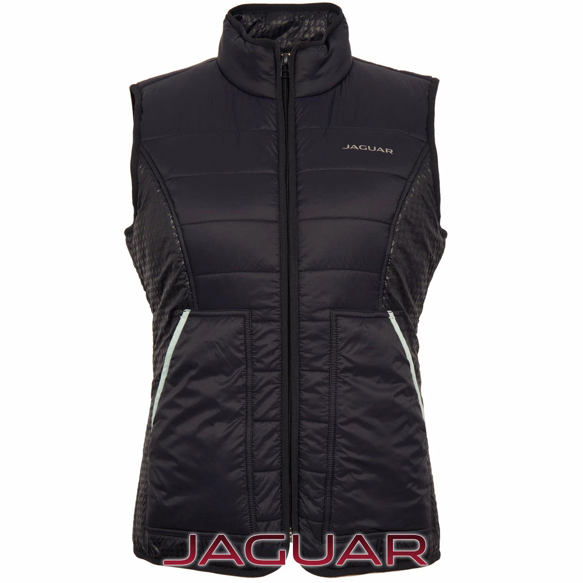 Marineblaue Jaguar Damenweste mit großen, praktischen Taschen, Hahnentrittmuster an der Kragen-Innenseite sowie Seiteneinsätze mit eisblauen Details. Jaguar-Schriftzug auf der Brust.