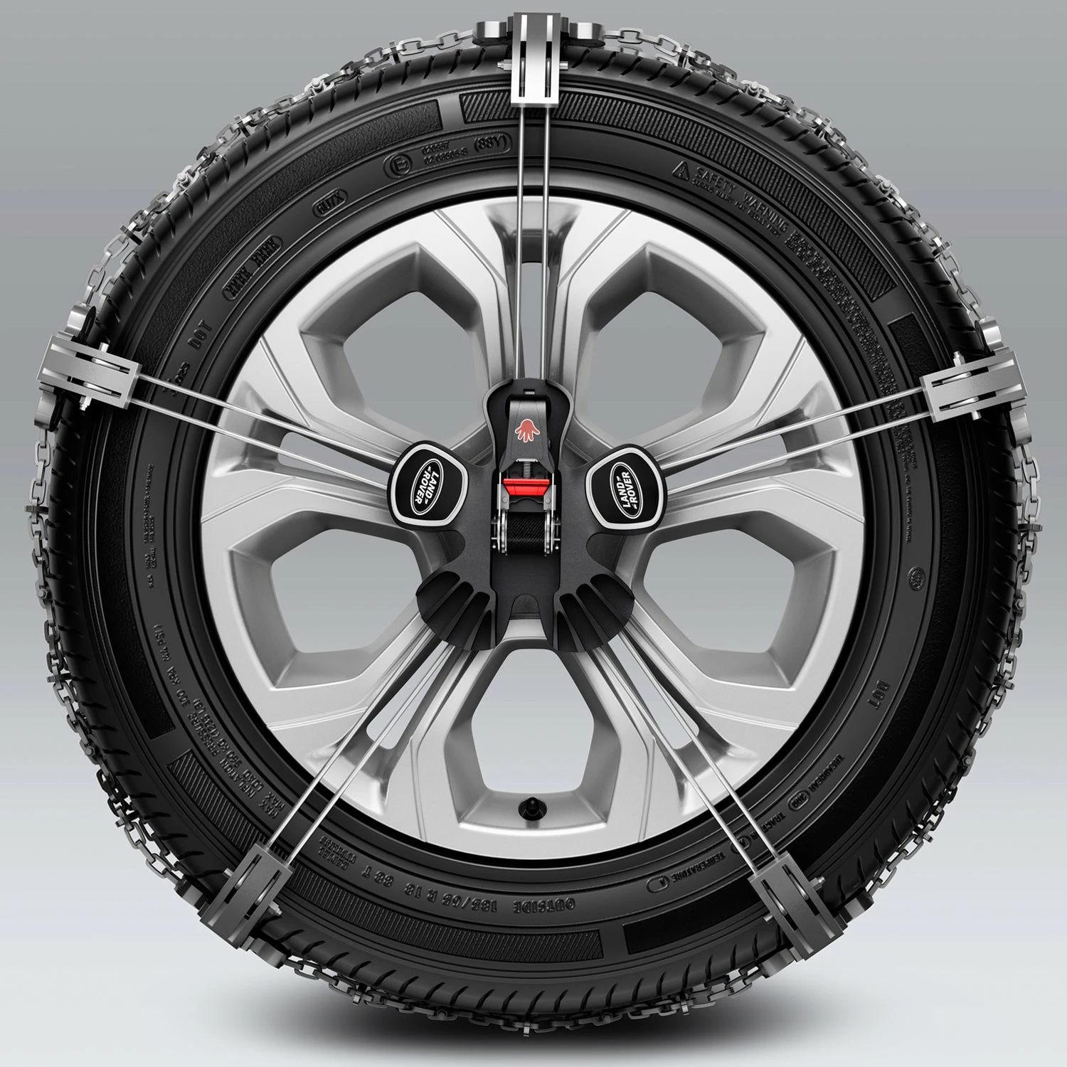 Die Original Land Rover Schneetraktionshilfe verbessert das Lenk- und Bremsverhalten auf schnee- und eisbedeckten Straßen.