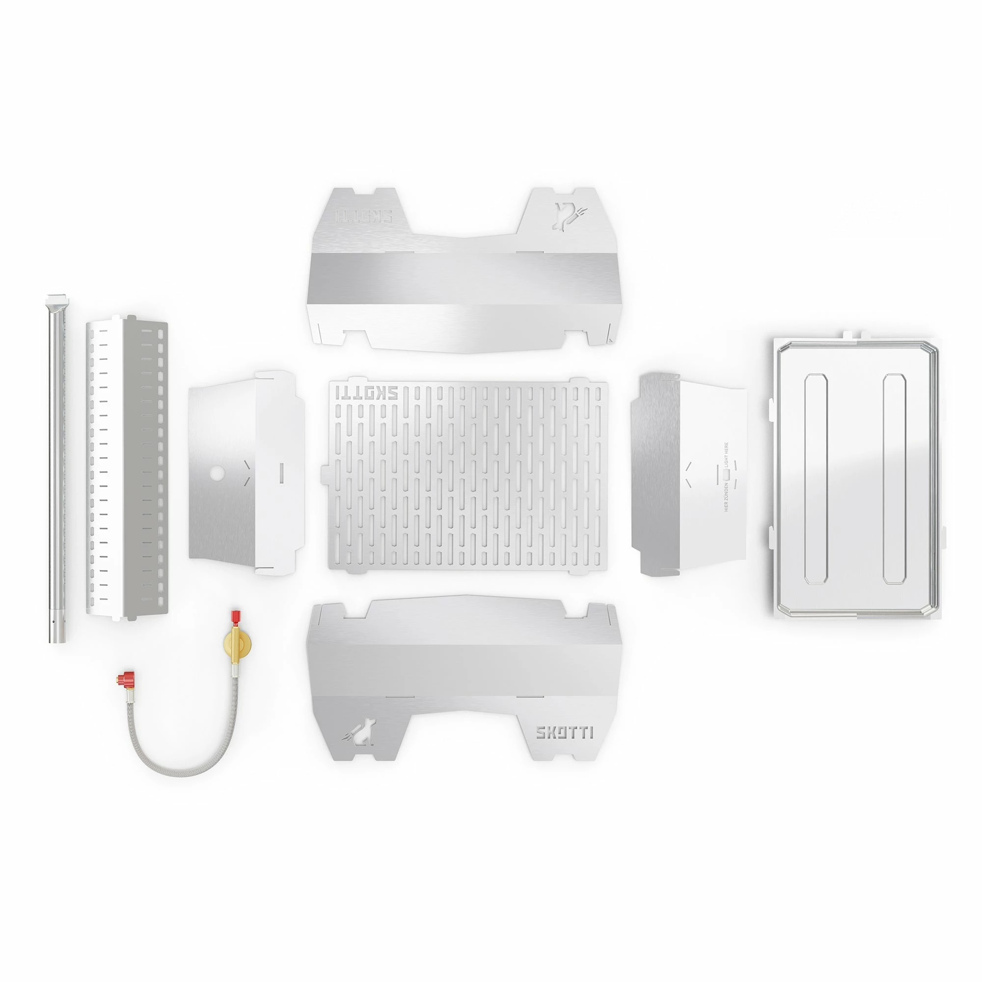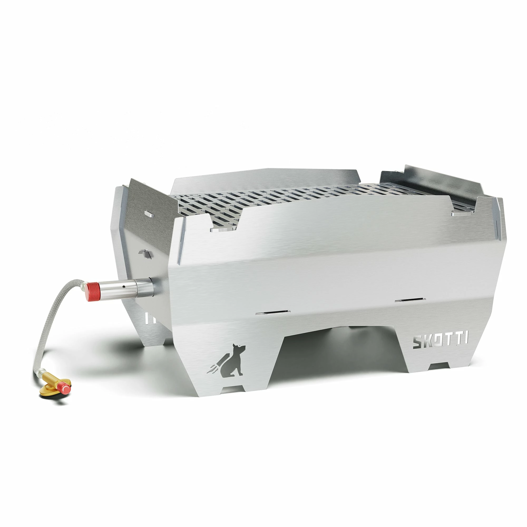 Der Skotti Grill kann mit Kohle, Holz oder Gas betrieben werden. Für die Nutzung mit einer handelsüblichen Camping Gaskartusche ist ein Gasschlauch mit Regulator im Lieferumfang enthalten.