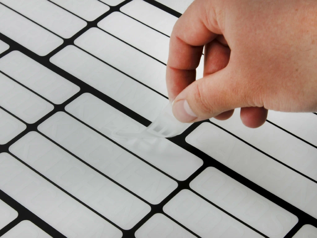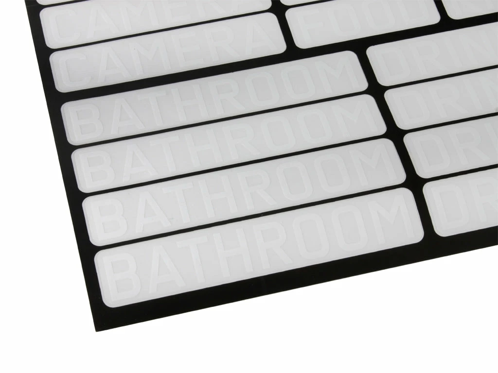 Weiße Schrift auf klarem Vinyl für deutliche Lesbarkeit.